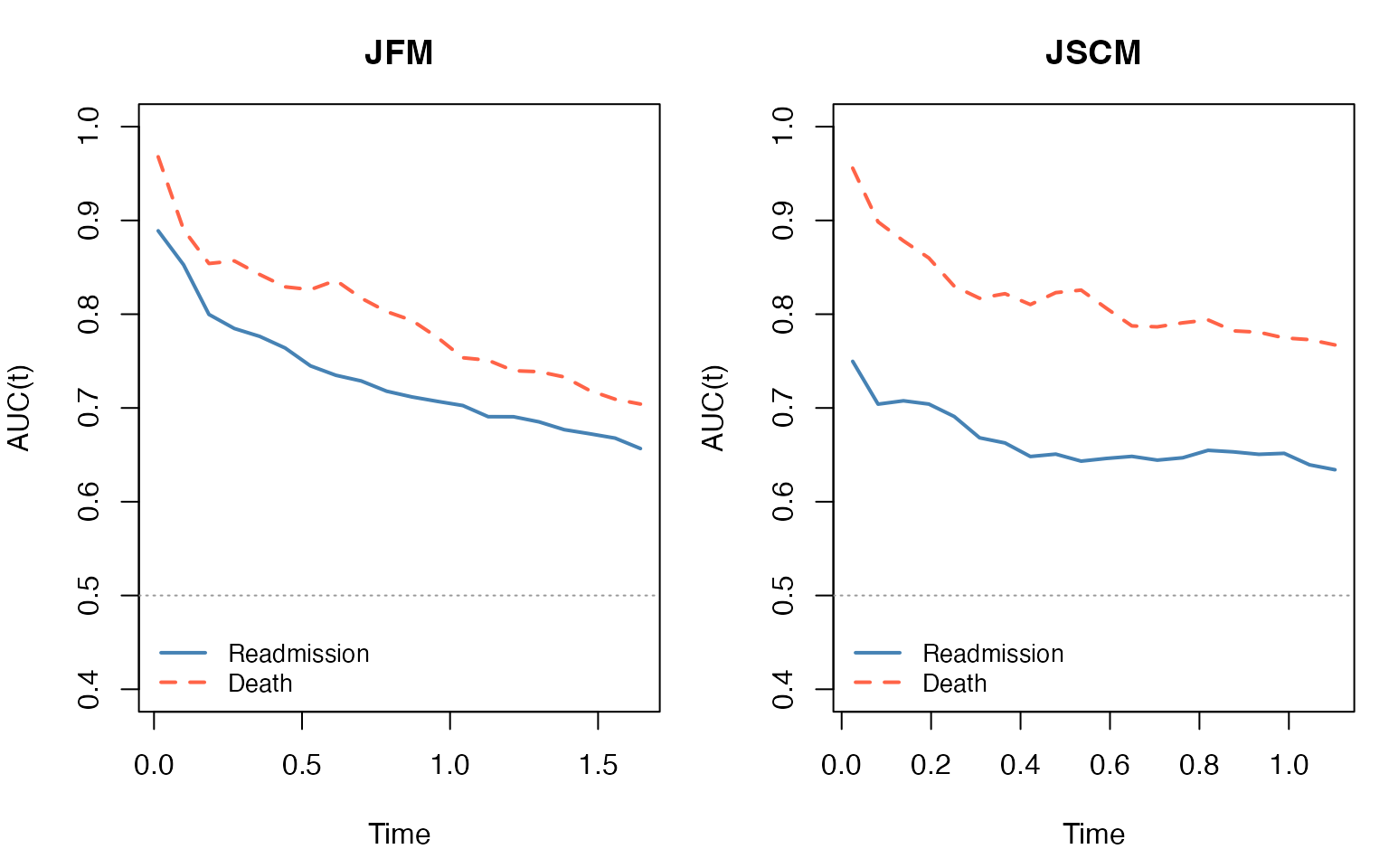 xlab = "Time", ylab = "AUC(t)", main = "JFM", ylim = c(0.4, 1))