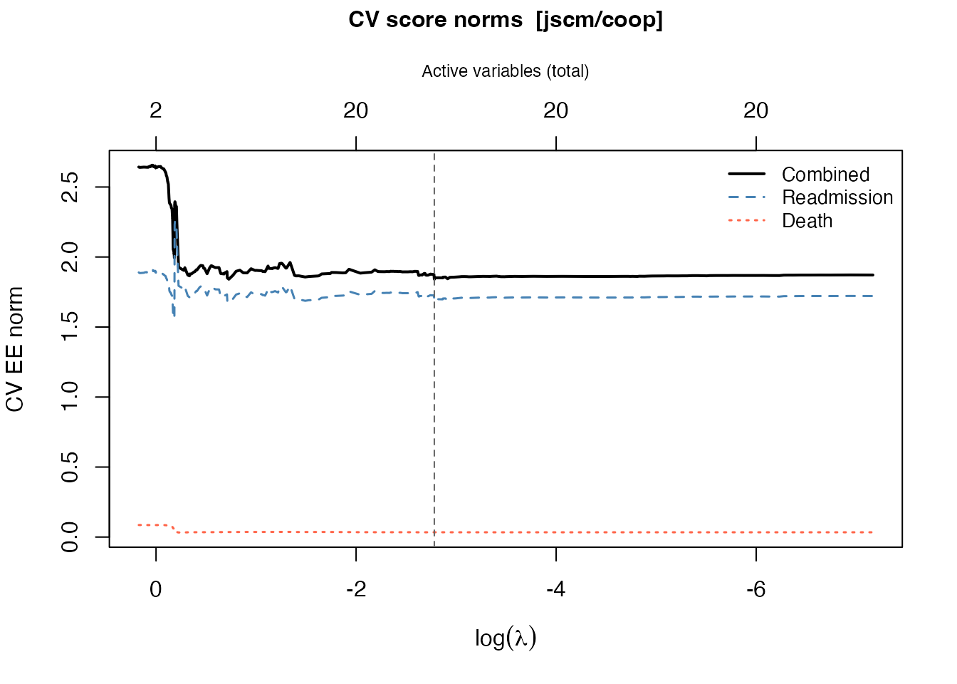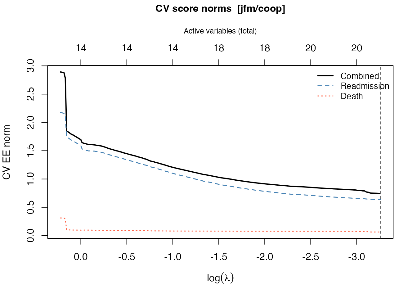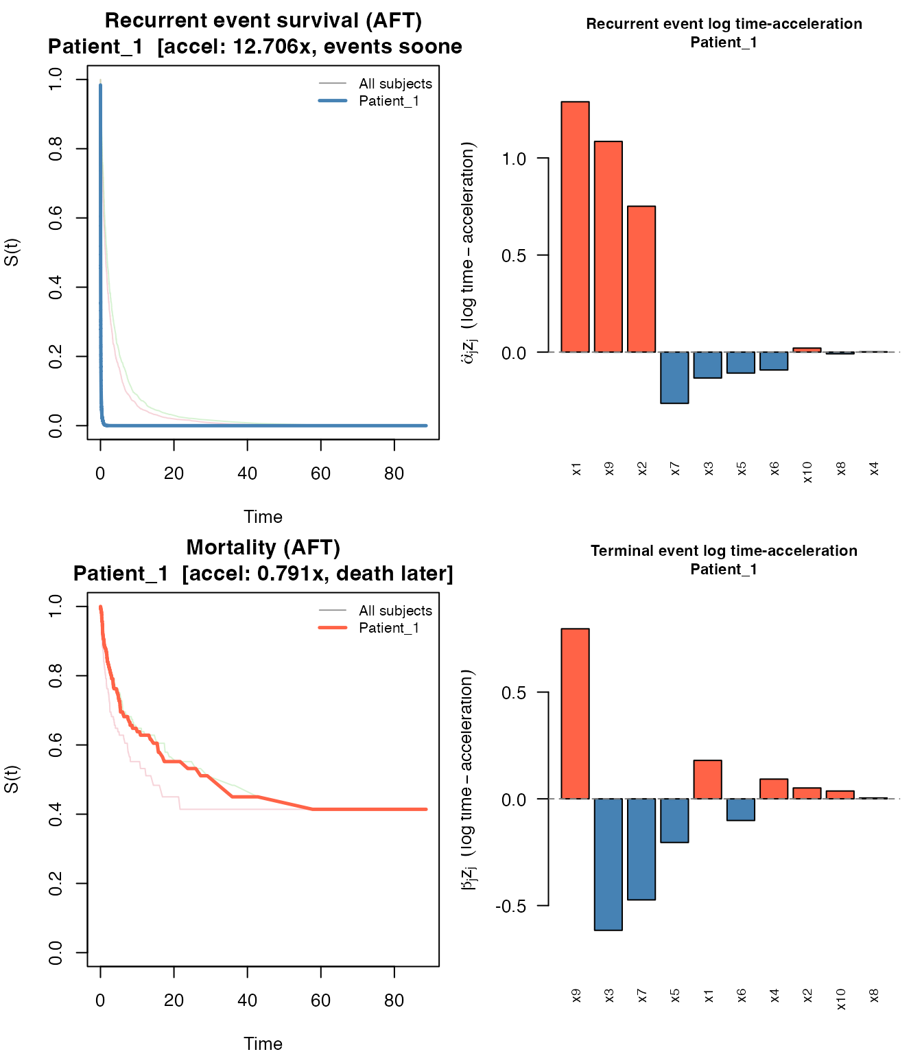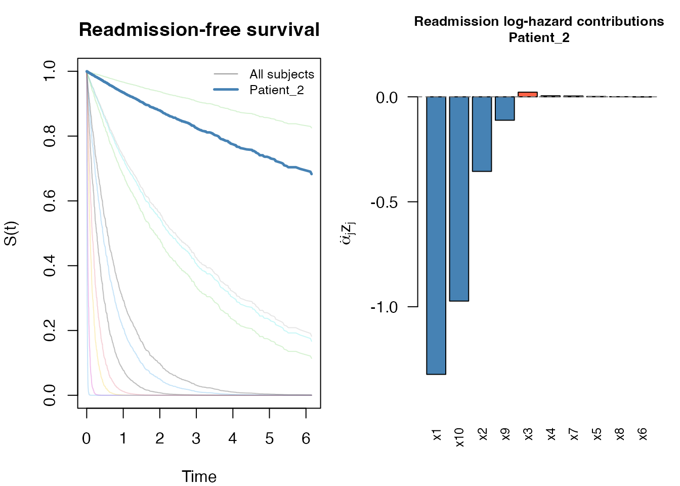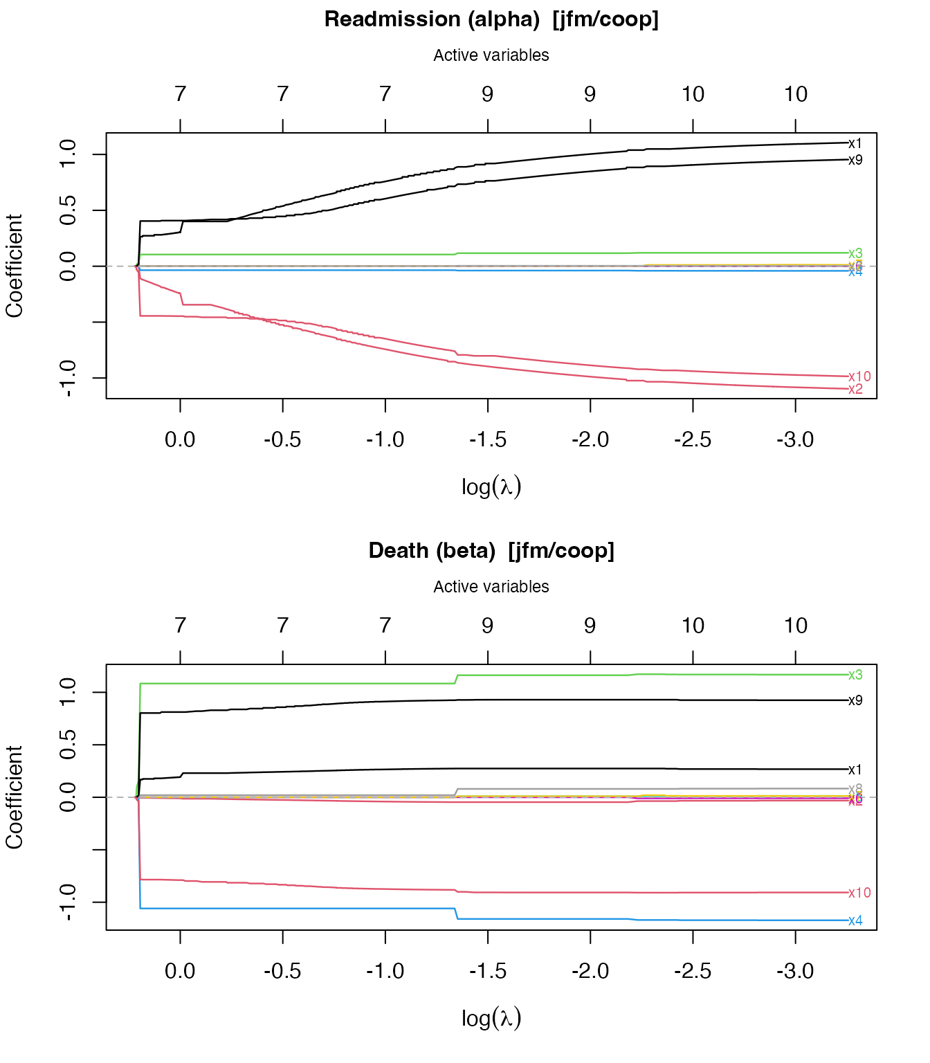 #> 6 2 1.7574405 1.8132809 1 0 0.3311792 -2.01421050 0.2119804JFM: 500 subjects, 1513 rows, 1013 readmissions, 104 deaths