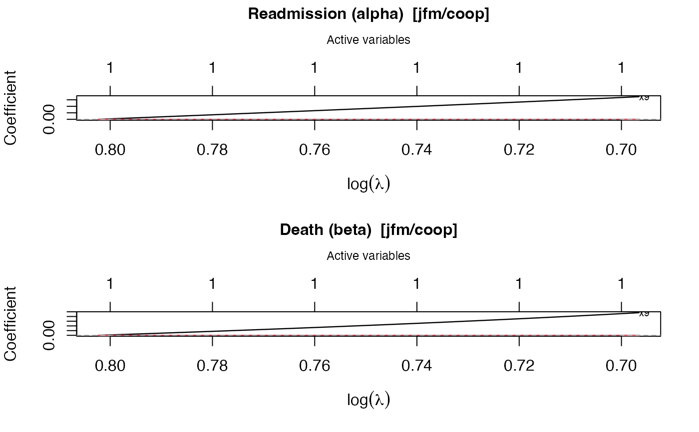 plot.swjm_path.RdProduces a glmnet-style plot of coefficient trajectories versus \(\log(\lambda)\) along the stagewise regularization path. Two panels are drawn by default: one for the readmission sub-model (alpha) and one for the death sub-model (beta). The top axis of each panel shows the number of active variables at that lambda.