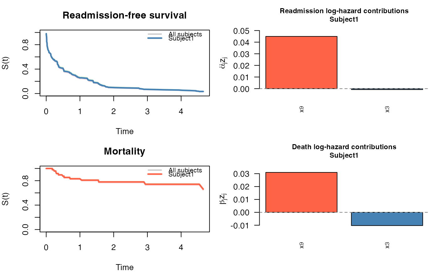 JFM — returns survival curves for both processes using the Breslow cumulative baseline hazards. For subject \(i\) with covariate vector \(z_i\): $$ S_{\text{re}}(t \mid z_i) = \exp\!\bigl(-\hat\Lambda_0^r(t)\, e^{\hat\alpha^\top z_i}\bigr), \quad S_{\text{de}}(t \mid z_i) = \exp\!\bigl(-\hat\Lambda_0^d(t)\, e^{\hat\beta^\top z_i}\bigr). $$