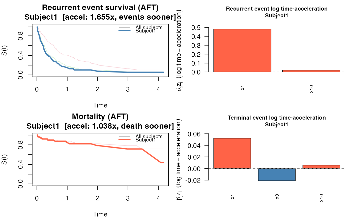 JSCM — returns survival curves for both processes using a Nelson-Aalen baseline on the accelerated time scale. For subject \(i\): $$ S_{\text{re}}(t \mid z_i) = \exp\!\bigl(-\hat\Lambda_0^r(t\, e^{\hat\alpha^\top z_i})\bigr), \quad S_{\text{de}}(t \mid z_i) = \exp\!\bigl(-\hat\Lambda_0^d(t\, e^{\hat\beta^\top z_i})\bigr). $$ The linear predictor \(\hat\alpha^\top z_i\) is a log time-acceleration factor: the recurrence process for subject \(i\) runs on a time axis scaled by \(e^{\hat\alpha^\top z_i}\) relative to the baseline. Each predictor contributes \(\hat\alpha_j z_{ij}\) to this log-scale factor, so \(e^{\hat\alpha_j z_{ij}}\) is the multiplicative factor on the time scale attributable to predictor \(j\) alone. Values greater than 1 accelerate events (shorter times); values less than 1 decelerate them (longer times).